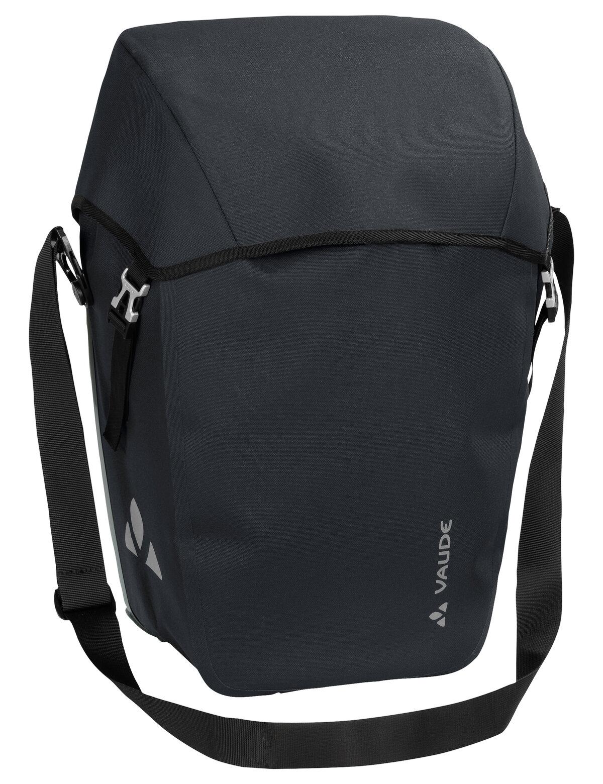 Obereisenbach lässt grüßen! Die urbane Radtasche mit Deckelverschluss wird am süddeutschen VAUDE-Firmensitz in der kleinen Ortschaft Obereisenbach hergestellt. Das robuste Material in textiler Optik ist komplett PVC-frei und wasserdicht verschweißt, was eine zusätzliche Regenhülle überflüssig macht. Die Tasche in klarem Design ist ausgestattet mit einem großen Hauptfach inkl. Staubalg. Die Tasche wird mit dem QMR 2.0-System und stabiler Rückenplatte rechts oder links am hinteren Gepäckträger befestigt, ist über einfach bedienbare Handrädchen justierbar und lässt sich schnell und einfach abnehmen. Mit einem Fahrradschloss kann sie direkt am QMR-Haken verriegelt werden. Durch den mitgelieferten Tragegurt kannst Du sie bequem über der Schulter tragen. Mit reflektierenden Elementen. Lieferumfang: eine Tasche (Single). Kann durch diese praktische Zubehör-Taschen ergänzt werden: Toolbag Back. Sortyour Back.